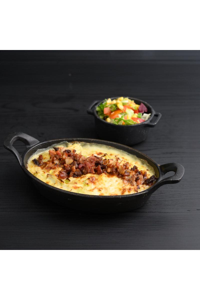 Værkets hjemmelagede plukkfisk laget på tradisjonelt vis. Toppes med bacon terninger og serveres i glødende jernform med en sidesalat